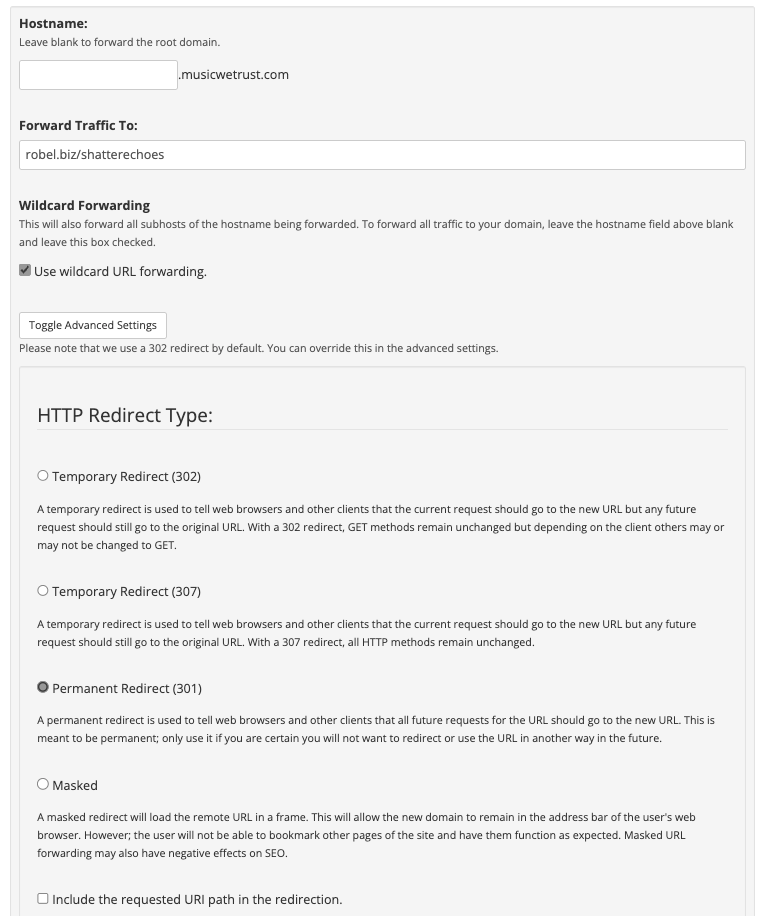 - HTTP redirect type: choose Permanent redirect (301).
